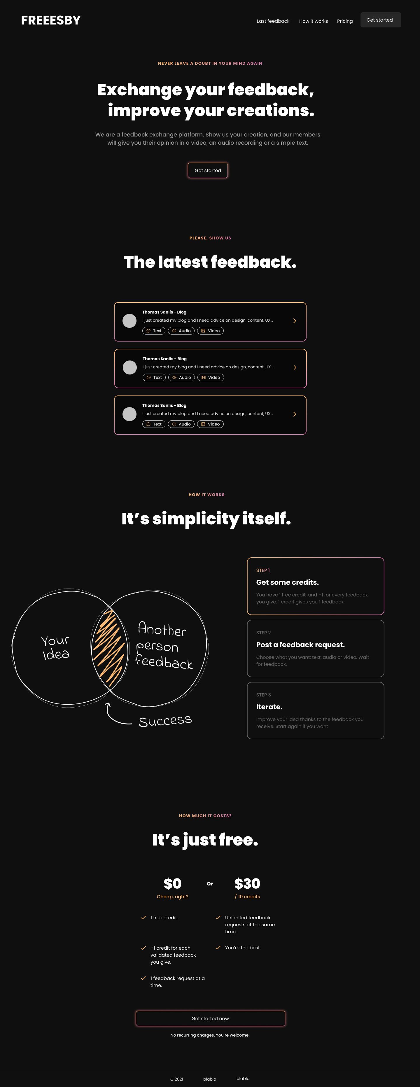 It's a feedback exchange platform. The concept is very straightforward: anyone can ask for feedback on anything, and anyone can give a feedback. A feedback costs 1 "credit" to the one who receives it, and earns 1 to the one who gives it. There will also be the possibility to buy credits.