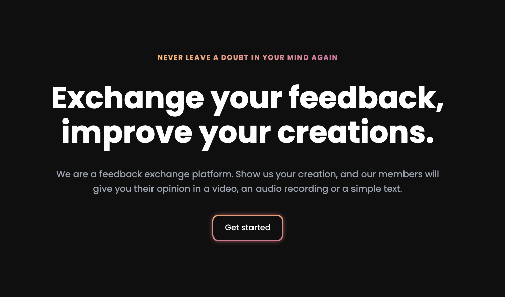 It's a feedback exchange platform. The concept is very straightforward: anyone can ask for feedback on anything, and anyone can give a feedback. A feedback costs 1 "credit" to the one who receives it, and earns 1 to the one who gives it. There will also be the possibility to buy credits.