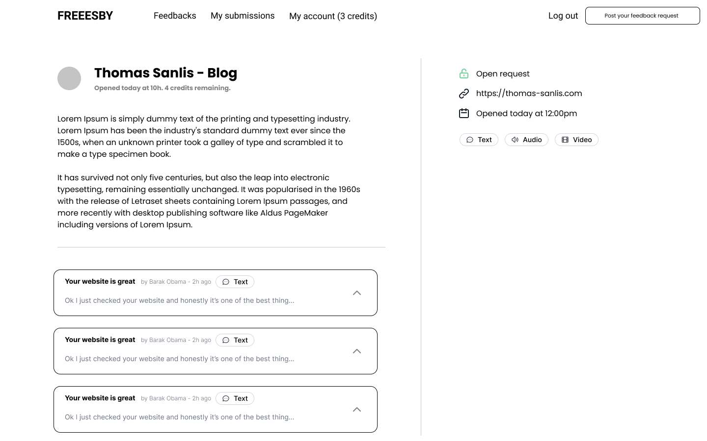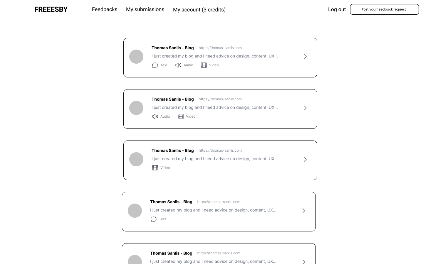 We made a total of 7 wireframes, and here is the last one which represents the page of a feedback request, with the feedback received at the bottom: